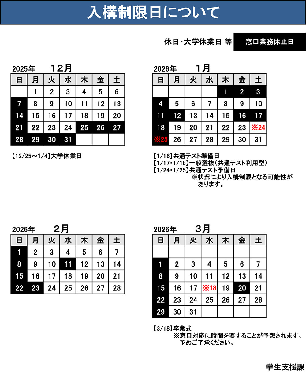 なお、夏季や年末から年度末にかけて、大学への入構が制限される期間があります。
