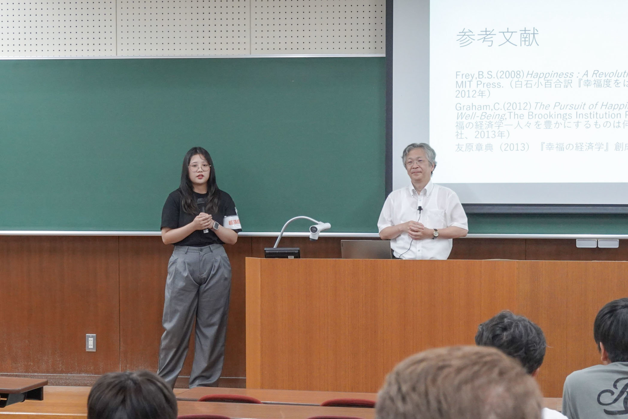今回の模擬授業では、「幸福の経済学」を紹介しました。大学のゼミナールでとりあげているテーマを高校生向けにわかりやすく説明しました。