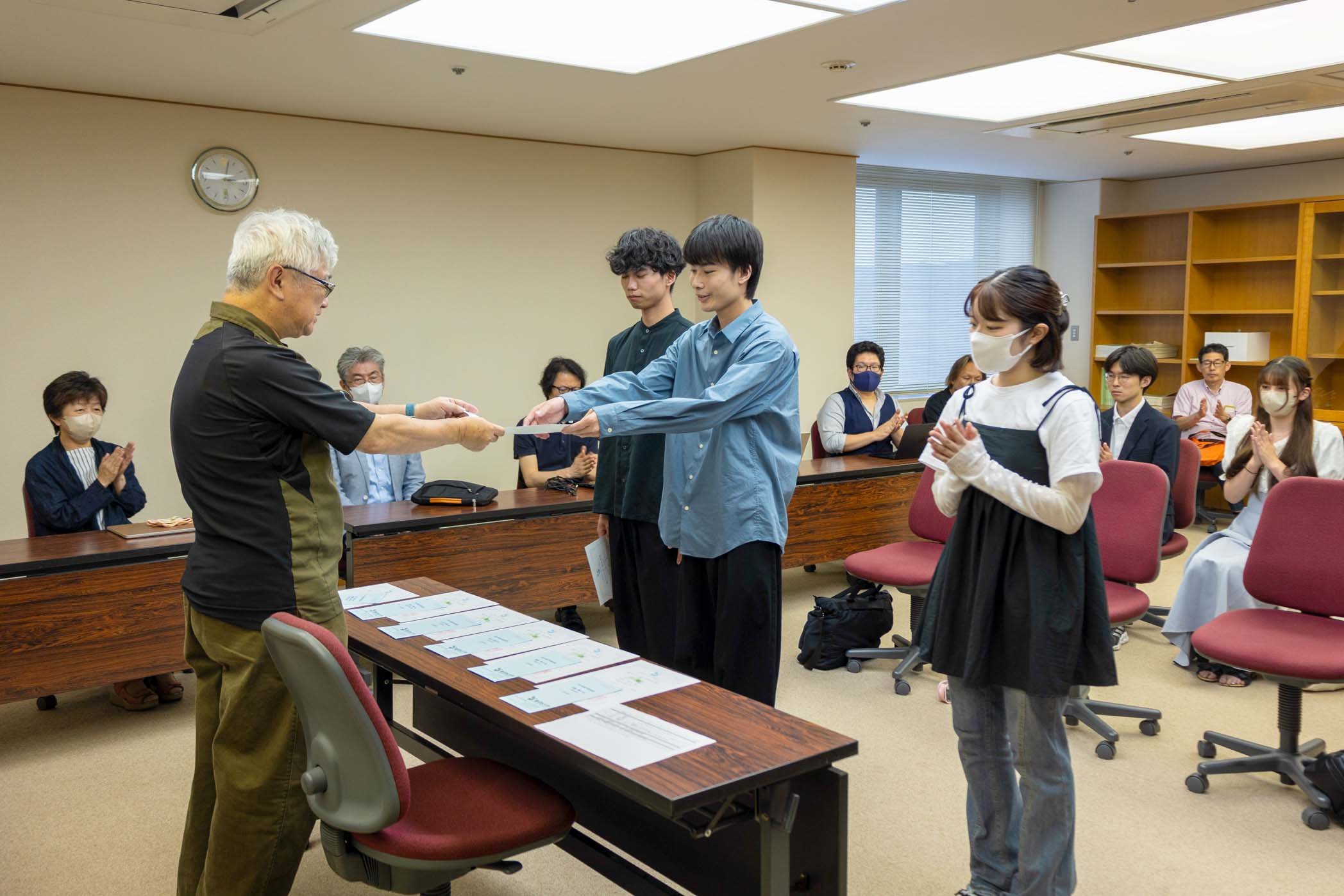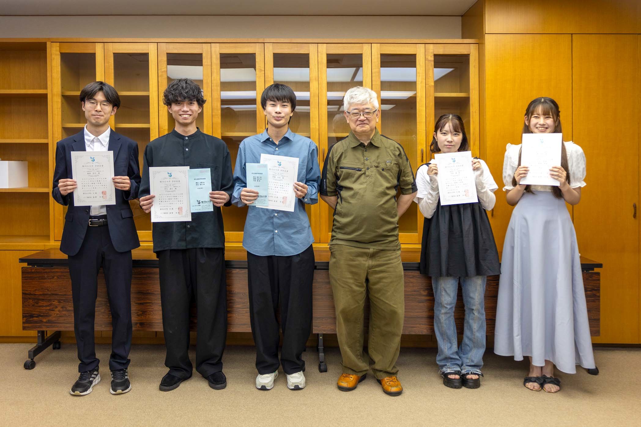 表彰式当日は、斎賀和彦学部長から表彰状と奨励金を手渡され、活動を指導された先生からもお祝いの言葉をいただきました。以下の令和7年度学部長賞受賞者の皆さん、本当におめでとうございます。