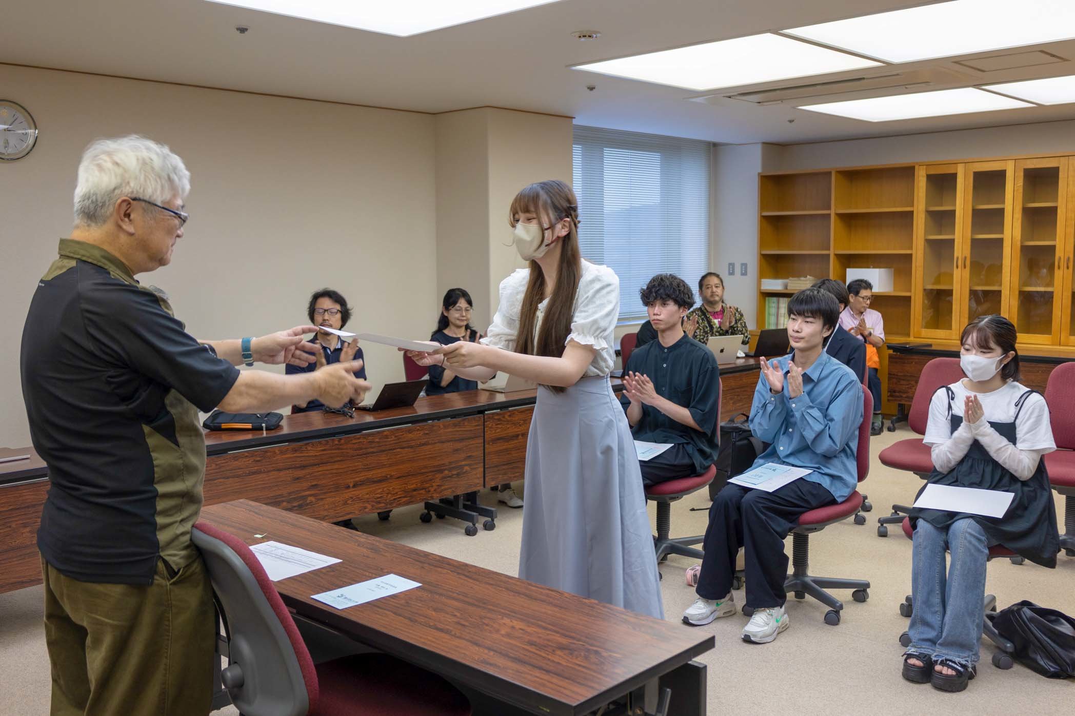7月10日(木)に、令和7年度メディア情報学部の学部長賞表彰式がおこなわれました。今年度は、地域における素晴らしく顕著な活動を認められた2つの団体と、資格取得や学業、課外活動などにおいて優秀な成績を収めた個人4名、合わせて8名の学生が学部長賞を受賞しました。