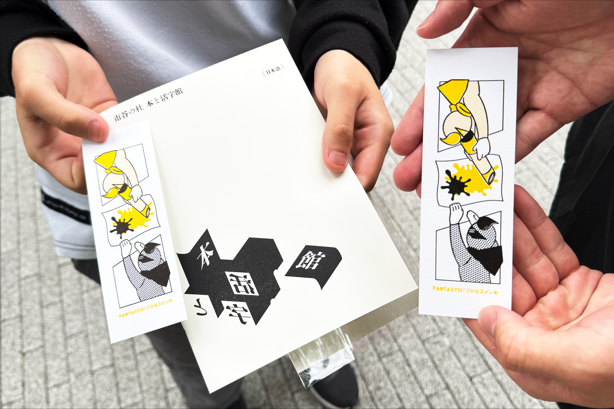 まず、2階の「制作室」で栞の印刷を体験しました。オフセット印刷について説明をうかがった後、卓上活版印刷機で実際に栞に黒いインクで印刷するという体験をし、受講生全員が栞を完成させました。印刷したインクが完全に乾くまでに一週間程度必要とのことで、色移りしないように袋にいれていただき大切に持ち帰ります。