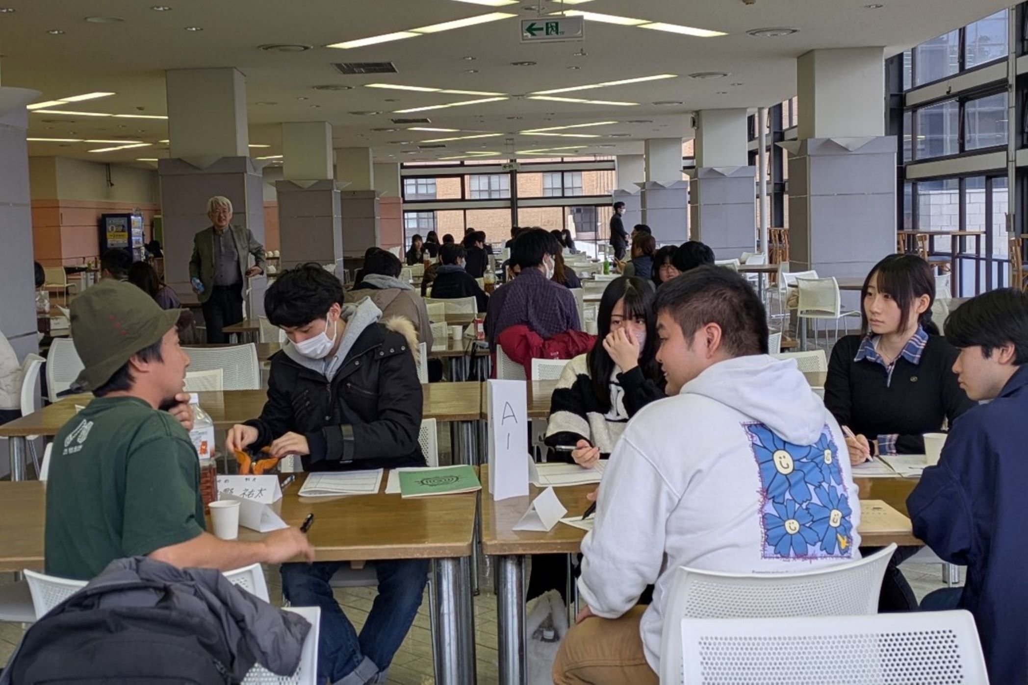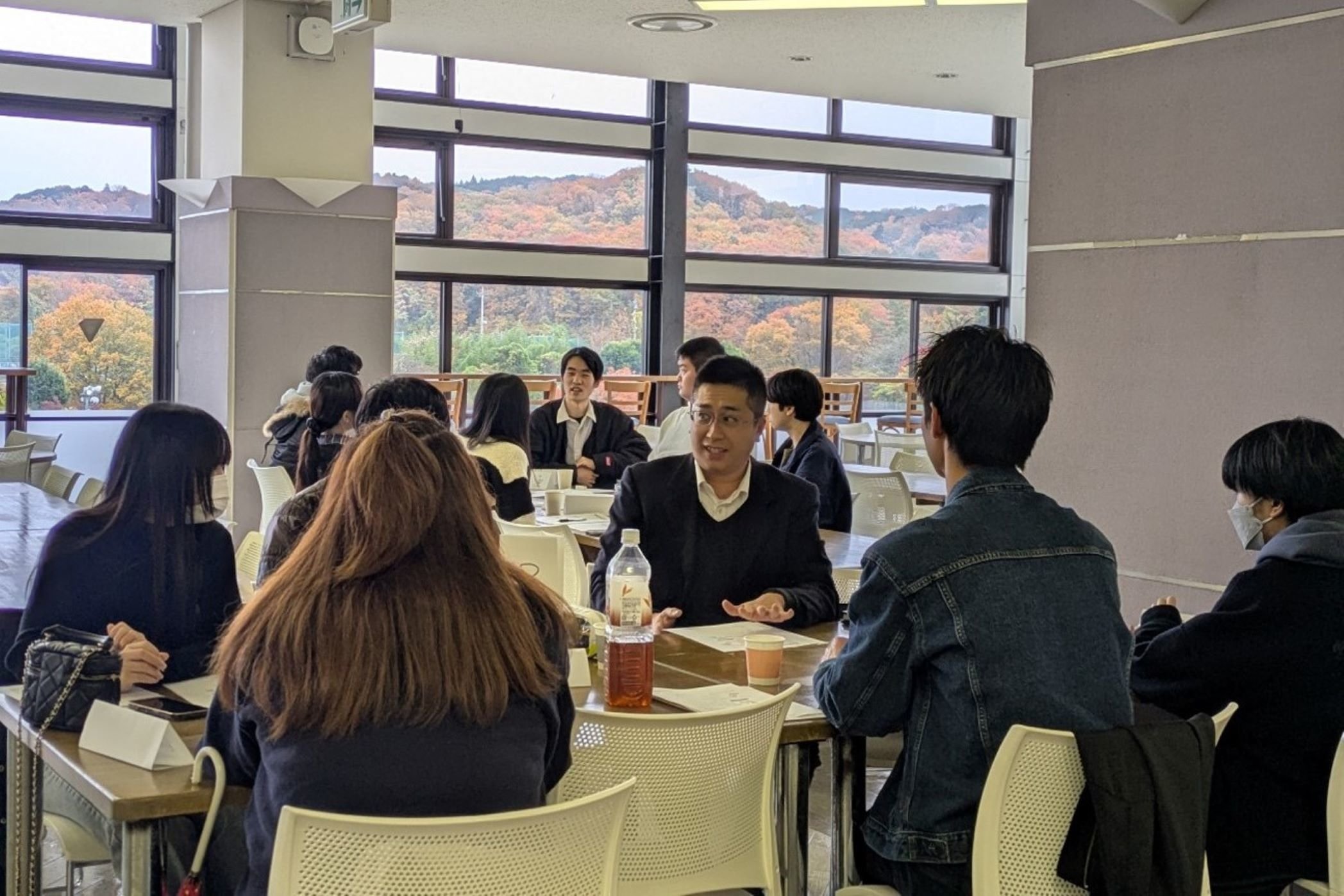 当日は、最初に佐古教授が、開会の挨拶、現在の就職状況の説明について説明されました。その後、数人のグループ別に、各界でご活躍の7人の社会人、そして 3人の4年次生との交流を行いました。最後はフリーセッションで、臨床心理学部専攻と犯罪心理学専攻の修士1年の2人にも加わっていただきました。