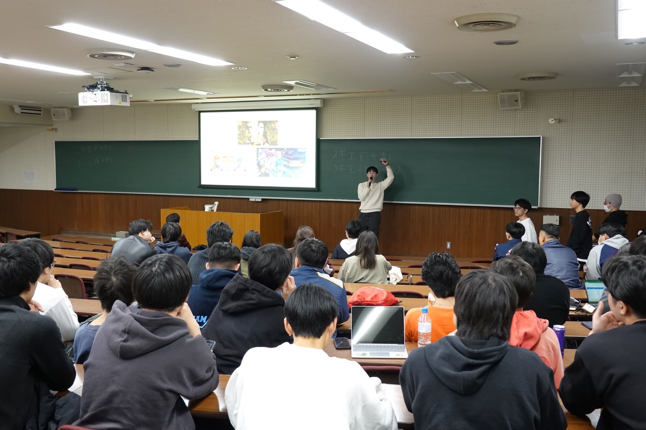 この会場には、交通や物流に関わる問題を自ら発見し、それが本当に解決する価値があるかを議論した上で、問題を解決するための方策の基礎を学んでいる小澤ゼミ、ホテルの視察等フィールドワークを交えながらホテル業界(旅館、ブライダルを含む)・企業研究を進めている式場ゼミ、「グローバル化時代の人のマネジメント」をテーマとしている羽渕ゼミ、そして、金融に関する論文を作成し学外の論文コンテストに応募することを通して金融の基礎知識の応用を試みている山田ゼミの3年生と、来年度この3ゼミを希望している2年生が集まりました。