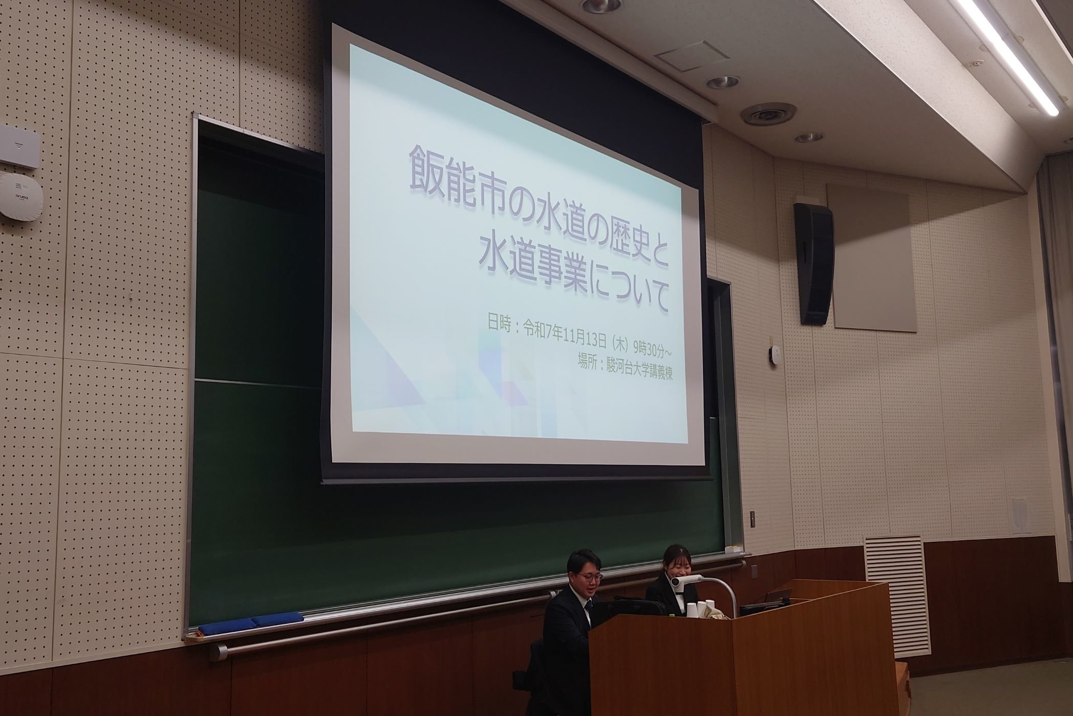 2025年11月13日(木)は、飯能市水道業務課吉川主事と水道工務課玉井主任にお越しいただき、「飯能市の水道の歴史と水道事業について」と題して講演を行っていただきました。飯能市の水道の歴史、水道事業と経営、水道の仕組み、漏水問題、災害対応等について、分かりやすくお話しいただきました。