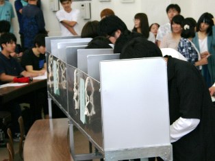 28日には、前週の討論会を踏まえた上で、飯能市選挙管理委員会から本物の投票台と投票箱をお借りして、模擬投票が行われました。学生たちは、実際の国政選挙と同様の手順で、候補者名と政党名を投票用紙に記入して投票しました。投票用紙の配布・立会人・開票については、法学部生が参加する飯能市選挙サポーターに協力してもらいました。