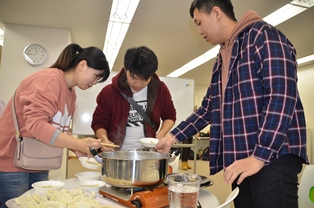 2日間とも50名以上の学生が参加し、積極的に調理を行いました。特に中国、ベトナム、ネパール人留学生の有志の学生は、自分たちの母国の料理を作るということもあり、調味料の準備や味付けなど、非常に積極的に協力をしてくれました。参加学生は、辛口の涼拌麺やスパイスのきいたネパールカレーに汗を流しながらも美味しそうに食べ、バインミーや水餃子をおかわりして何個も食べる学生もいました。留学生は、「母国の料理をみんなに知ってもらうきっかけになってとても嬉しい、次回もこのような会があればぜひ参加したい」と感想を寄せてくれました。