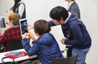 操作練習ではタブレット端末の基本操作を覚えていただくため、カメラアプリを使用して写真を撮り、撮影した写真を拡大・縮小するなどの操作を行いました。