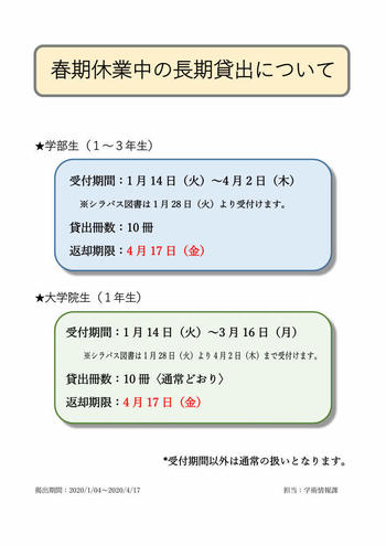 次の通り、春期休業に伴う長期貸出を行います。