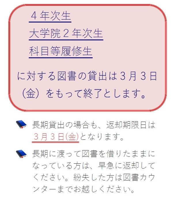 4年生・大学院2年生・科目等履修生への貸出は、3月3日(金)をもって終了とします。