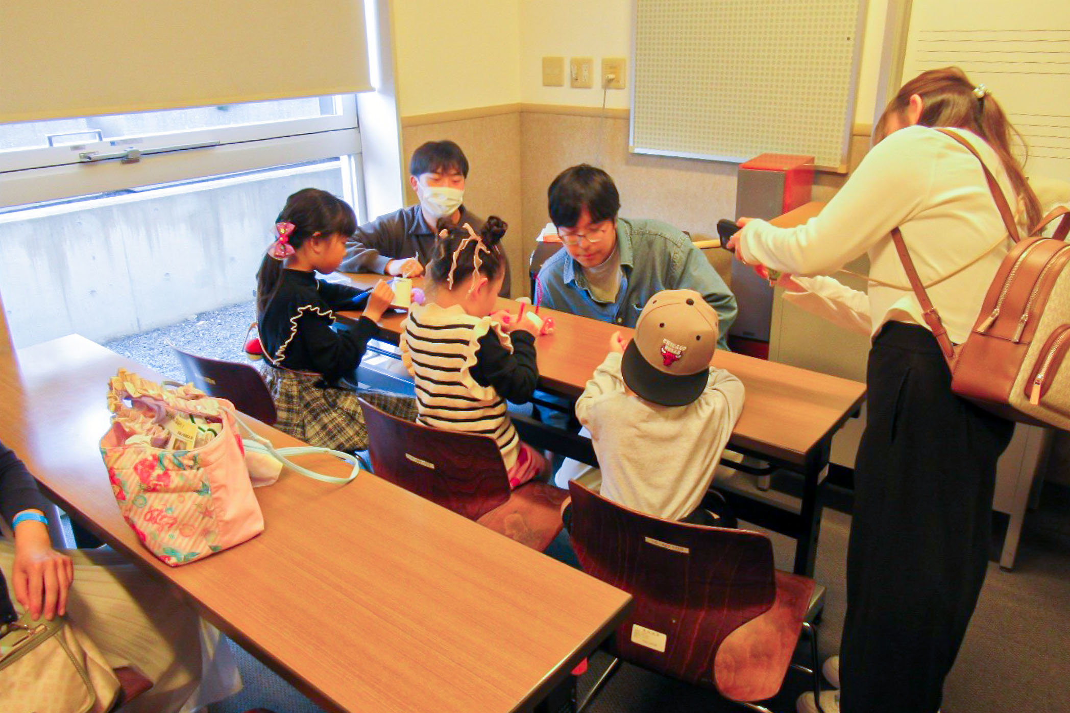 本イベントは、地域の子どもへの学び支援およびTJUPの認知度アップを目的として、地元で生きていく若い世代向けに「楽しく、学ぶ、体験する」をテーマとしたキッズイベントです。イベント内では、「ファミリーコンサート」、各会員の一押しの授業「わくわく教室」、各会員の特色を活かした「わくわくワークショップ」などが行われ、本学は「わくわくワークショップ」にメディア情報学部の船場教授と学生4名が参加し、「作ってあそぼう楽器のセカイ」というワークショップを行いました。