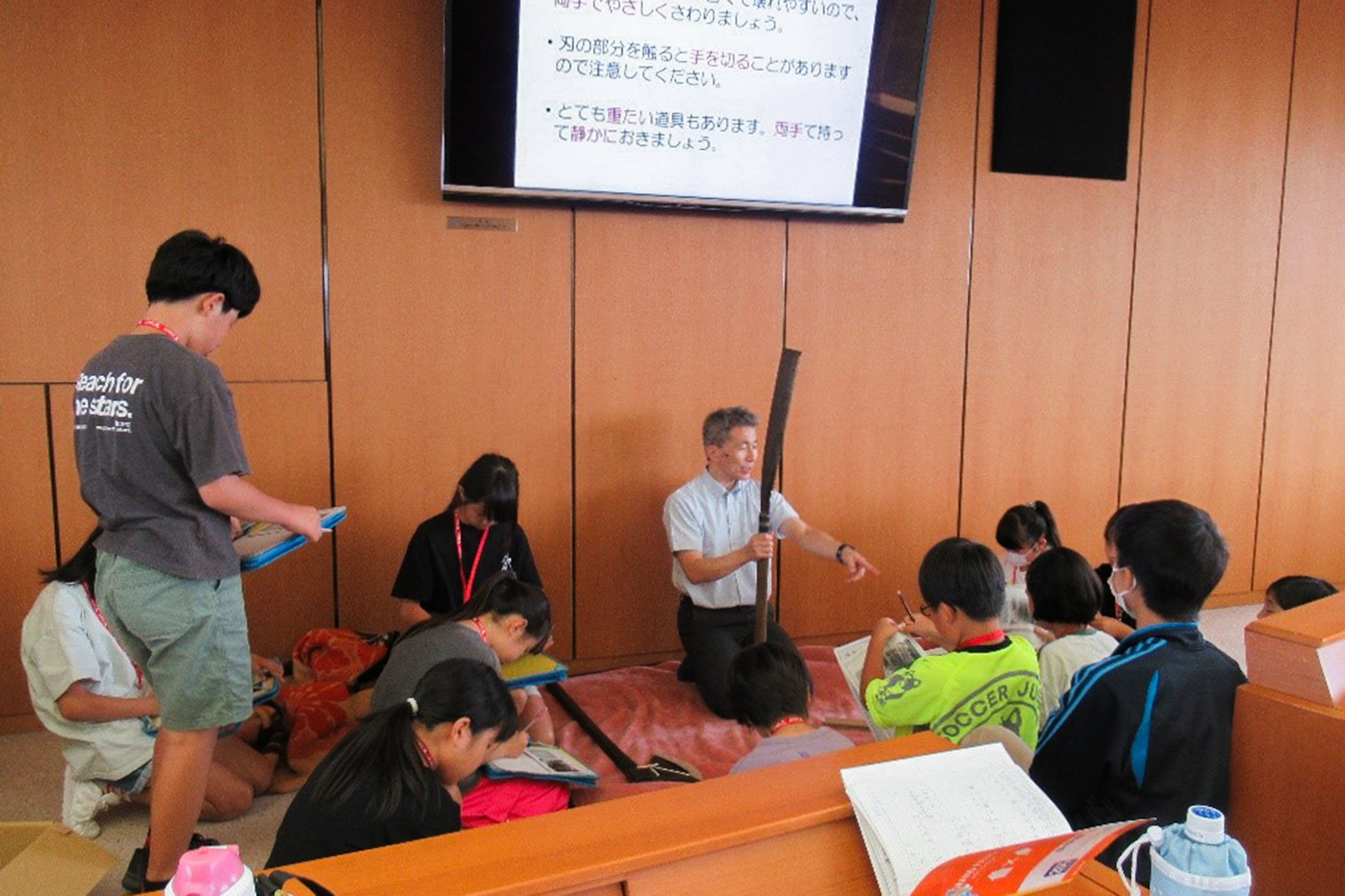 第1回目は、「触って感じる西川材の歴史 木のふしぎ・木の魅力」という学習プログラムで、飯能市立博物館と有限会社創林の職員が講師となり、西川材の歴史や、昔の職人が使用していたのこぎり等の道具に触れる体験形式の講義を行いました。