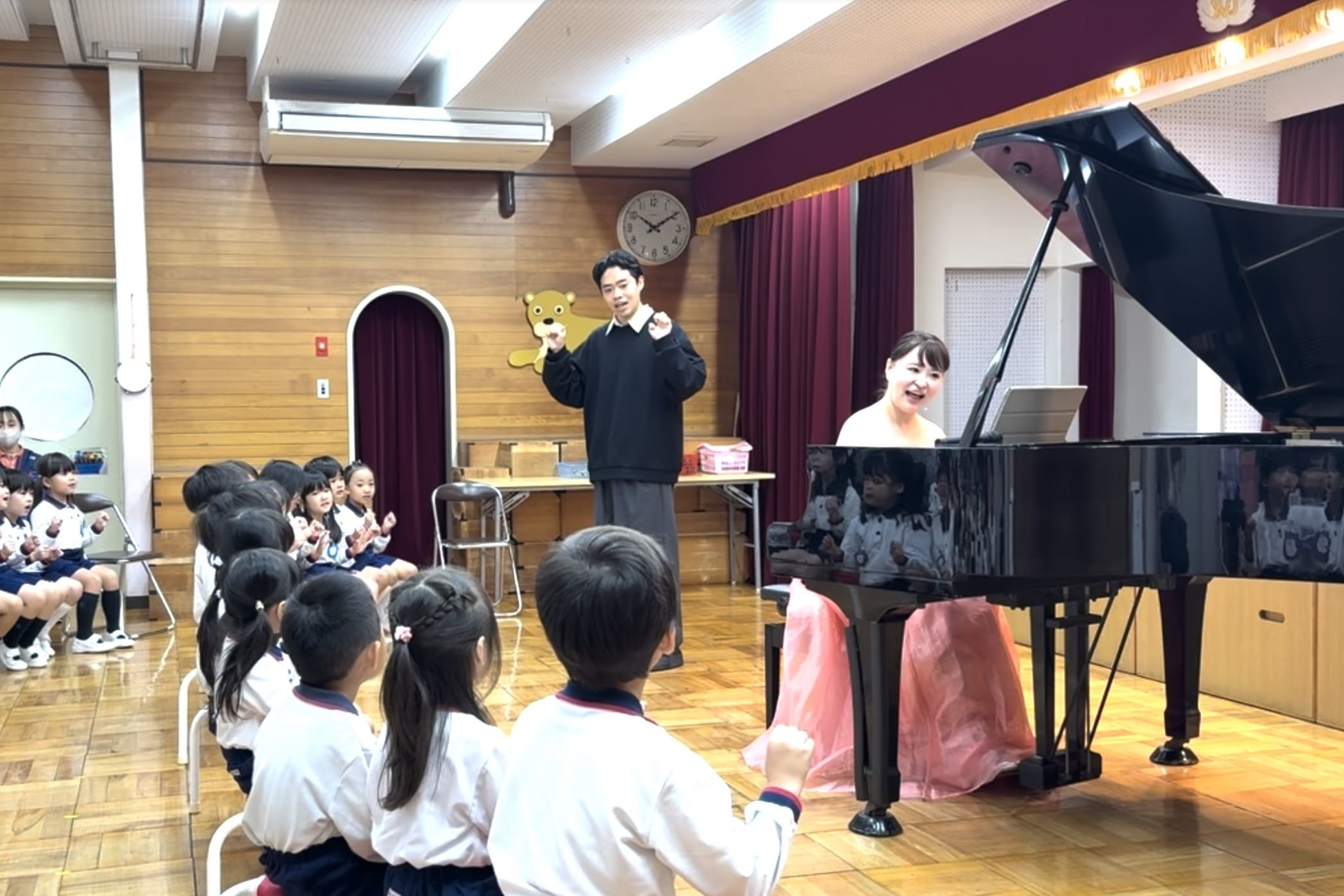 2025年10月16日、本法人に設置している駿河台大学第一幼稚園の遊戯室にて開催されたピアニストで、YouTuberとしても活躍する伊藤 慧(いとう けい)氏によるピアノコンサートに、駿河台大学メディア情報学部4年生 山谷 悠翔さんが参加しました。