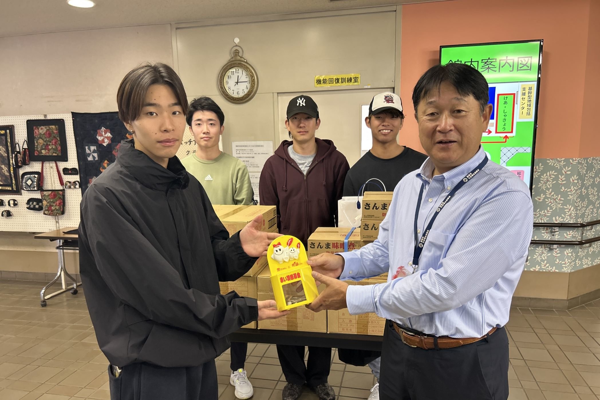社会福祉協議会に食品・募金をお渡しするメンバーと、双木和宏事務局長(右)