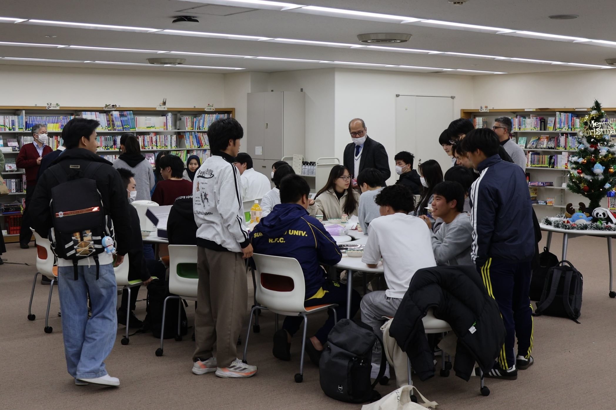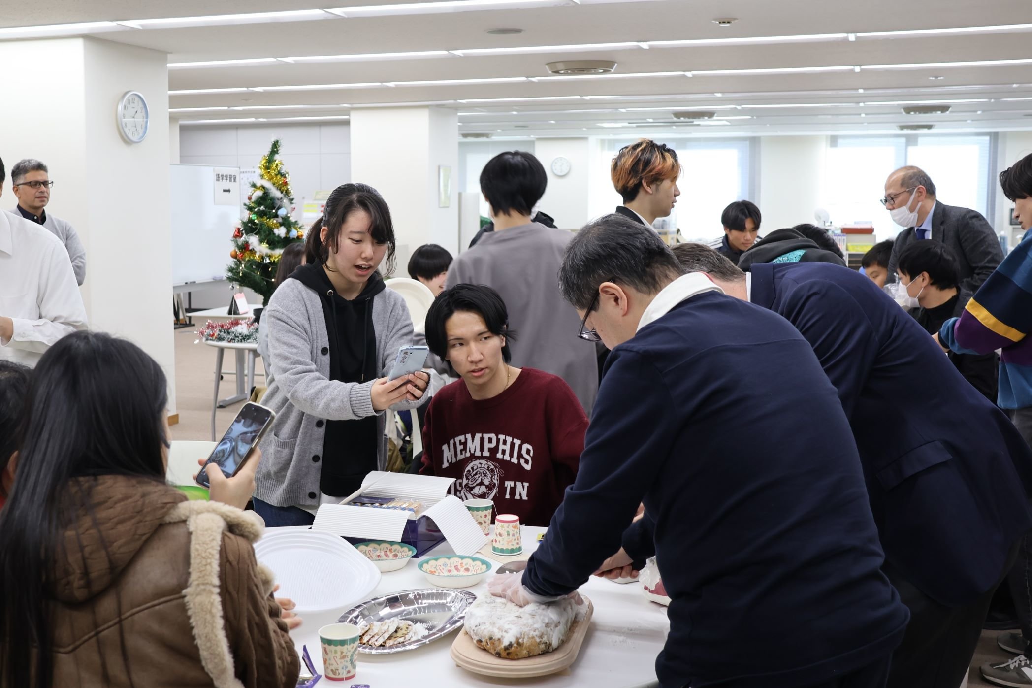 当日は50名を超える学生・教職員がグローバル教育センターに集まり、シュトレンを囲んで自然と会話が弾み、会場は終始賑やかな雰囲気に包まれました。