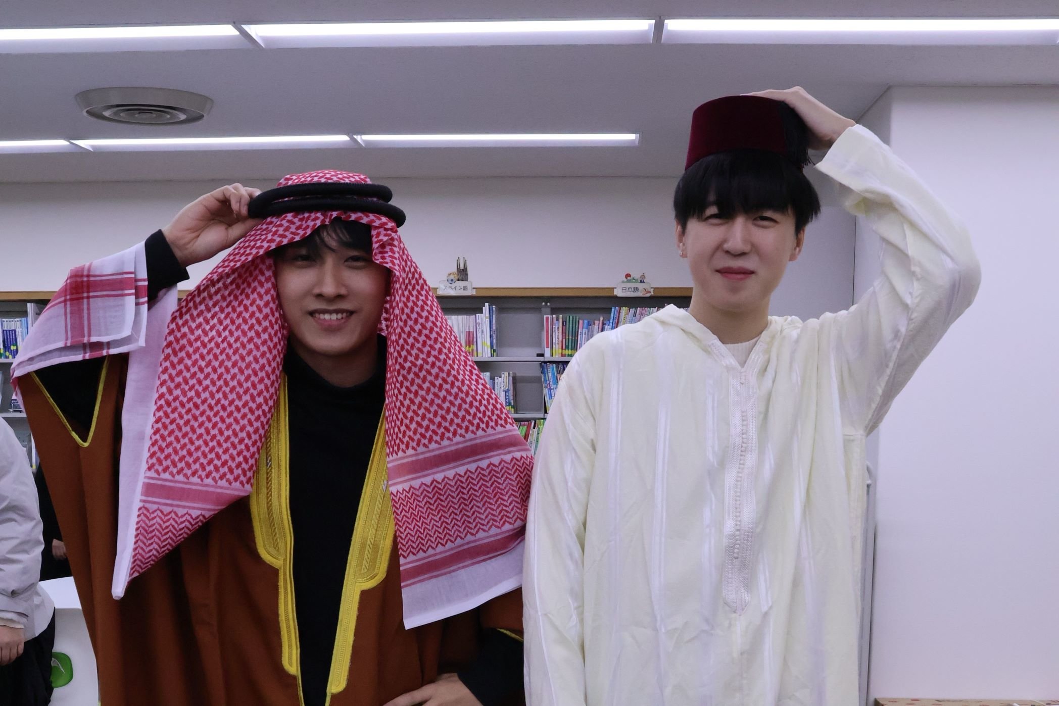 アラブの民族衣装を試着する学生の姿も見られ、異国情緒あふれる空間に。約30名の学生・教職員が参加し、香りや交流を楽しむ特別な時間となりました。