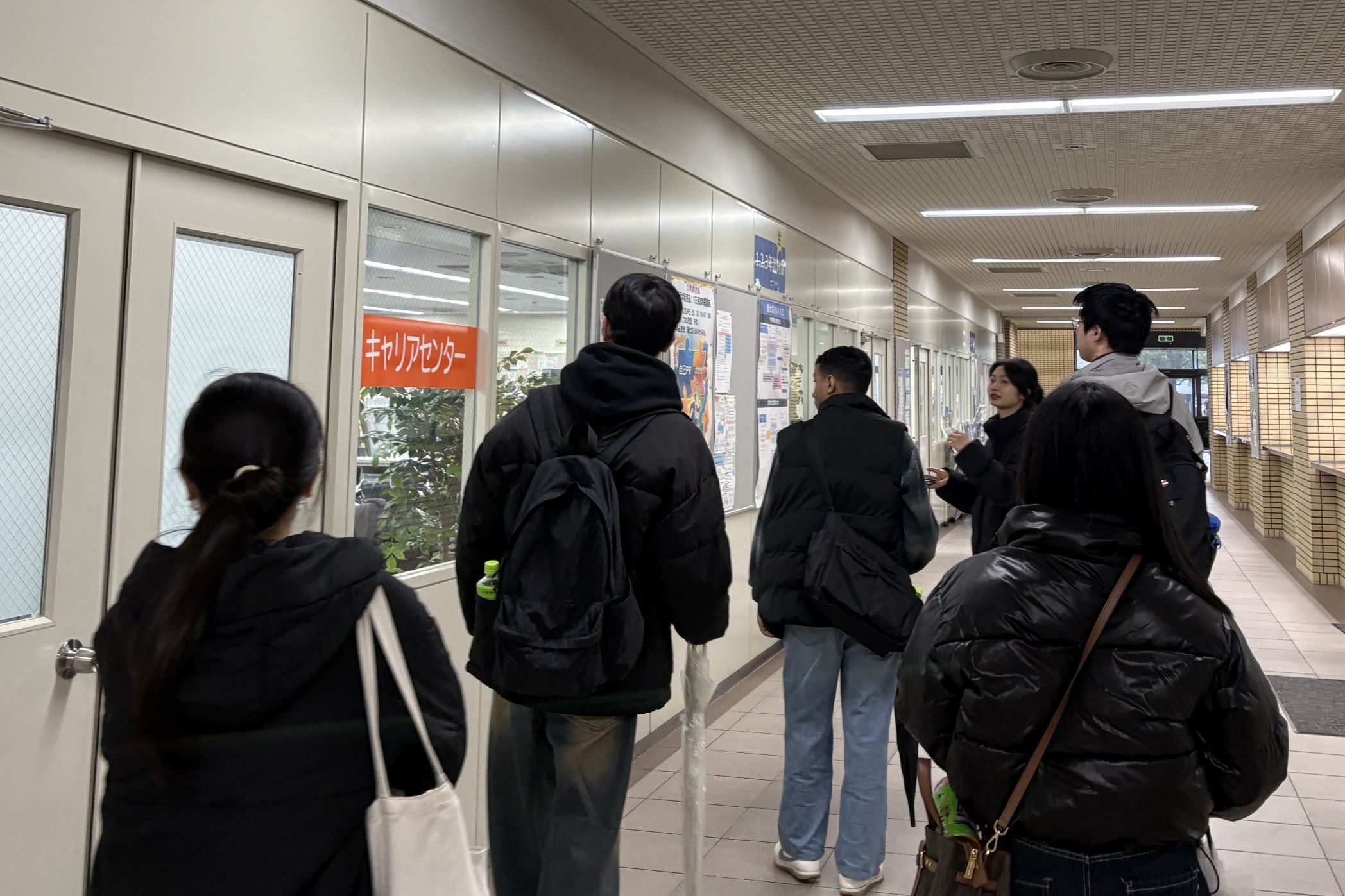 話し合いの後は、キャンパスを案内しました。困ったときに相談できる場所などを紹介し、楽しく学べる環境を大切にしてほしいと伝えました。