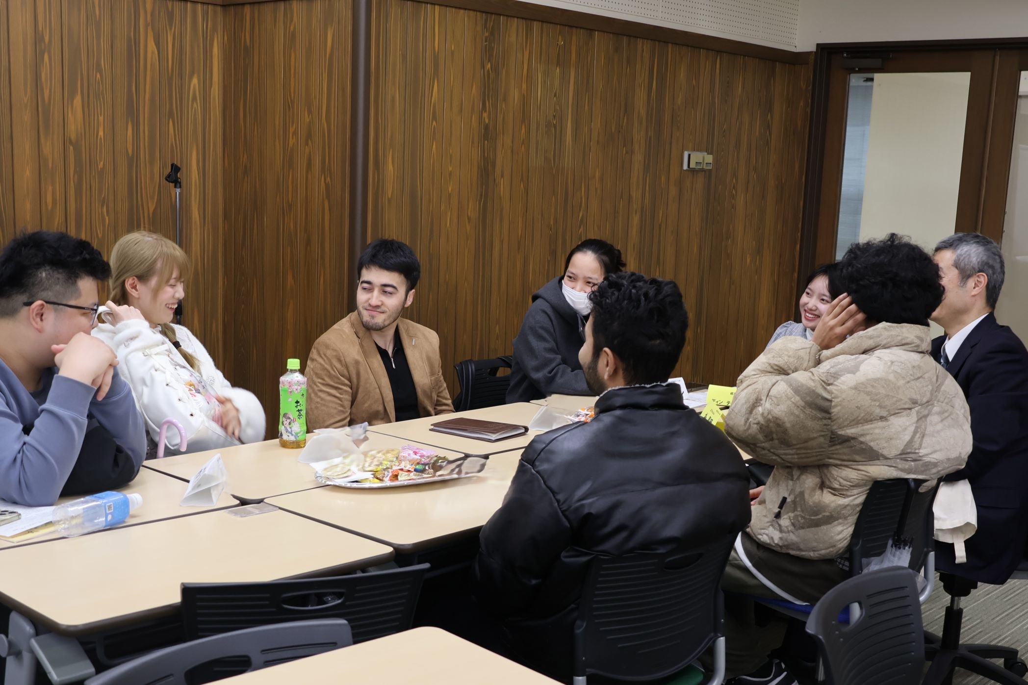 雨にもかかわらず、午前・午後ともに、多くの留学生が参加してくれました。教職員の紹介、入学準備に関する諸説明の後は、小グループに分かれての歓談です。教職員や先輩留学生も交え、大学生活についてアドバイスをもらったり、新しい友達を見つけたりできたようです。