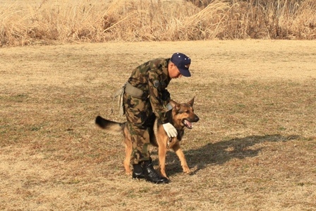 歩哨犬訓練を見学。隊員さんの指示に従う歩硝犬の見事な行動に全員、感心しました。