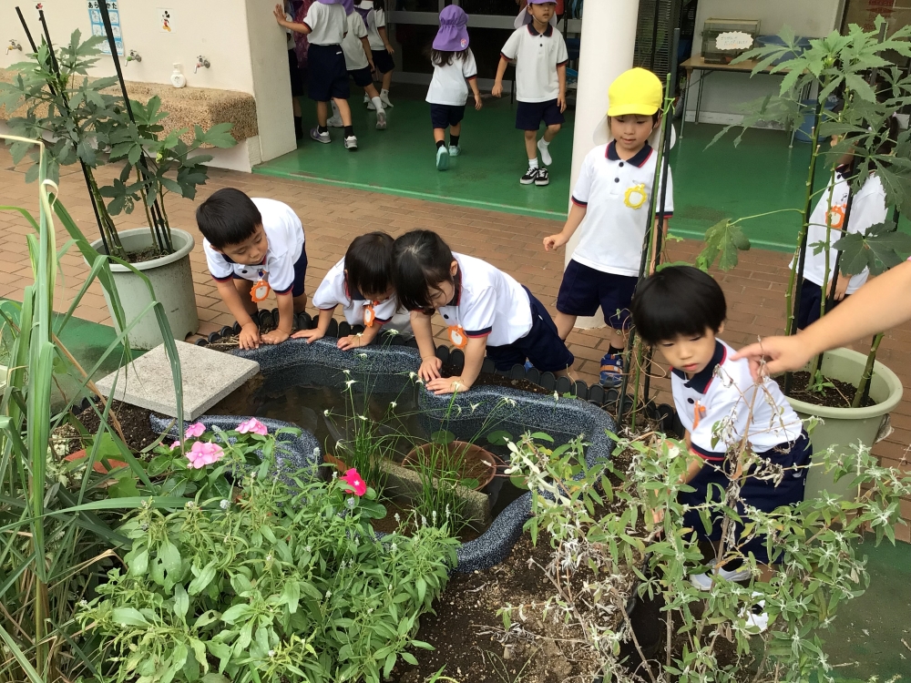 夏休み中に先生たちが作った花壇の真ん中にある、小さな池「ビオトープ」。