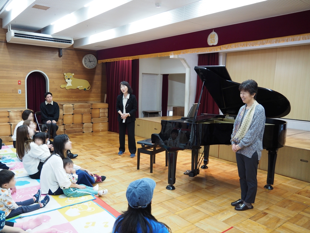 また、野菜の手遊びの曲が弾かれたり、幸せなら手をたたこうではみんなで鈴を鳴らして参加するなど、子どもたちが一緒に楽しめる工夫もたくさんありました。子どもたちはお部屋でも歌っている曲をピアノの素敵な演奏で聴くことができ、とても良い経験となりました。
