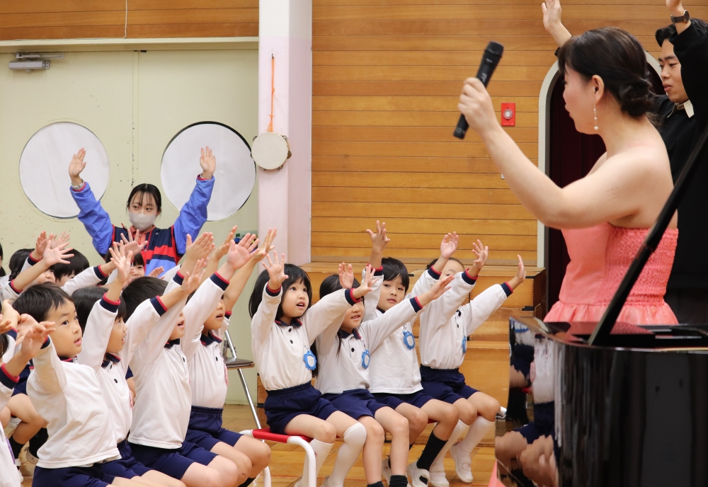 演奏の合間には、ピアノの鍵盤の数に関するクイズもあり、「鍵盤は何個あるでしょう?」という質問に「20個ぐらい?」「50個じゃない?」と想像する子どもたちに、先生が「88個だよ」と教えると、「えー、そんなにあるの?」と驚きの声があがっていました。