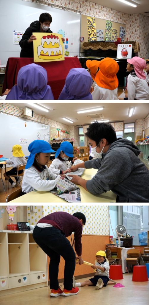 教室では、「紙飛行機・紙鉄砲」「お父さん鉄棒」「大型絵本・紙芝居」「大型絵本・紙芝居」「タオルでGO!」
