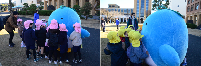 大学に到着すると、なんと駿河台大学の公式マスコットキャラクター「しゅんた」がみんなを出迎えてくれました! 「わあ!大きい!」「かわいい!」と大歓声。しゅんたと一緒に記念撮影をしたり、触れ合ったりして、最初からニコニコ笑顔の子供たちでした。