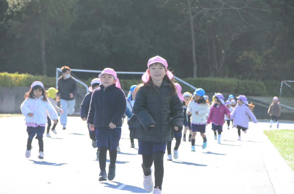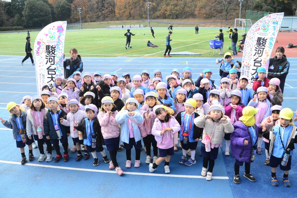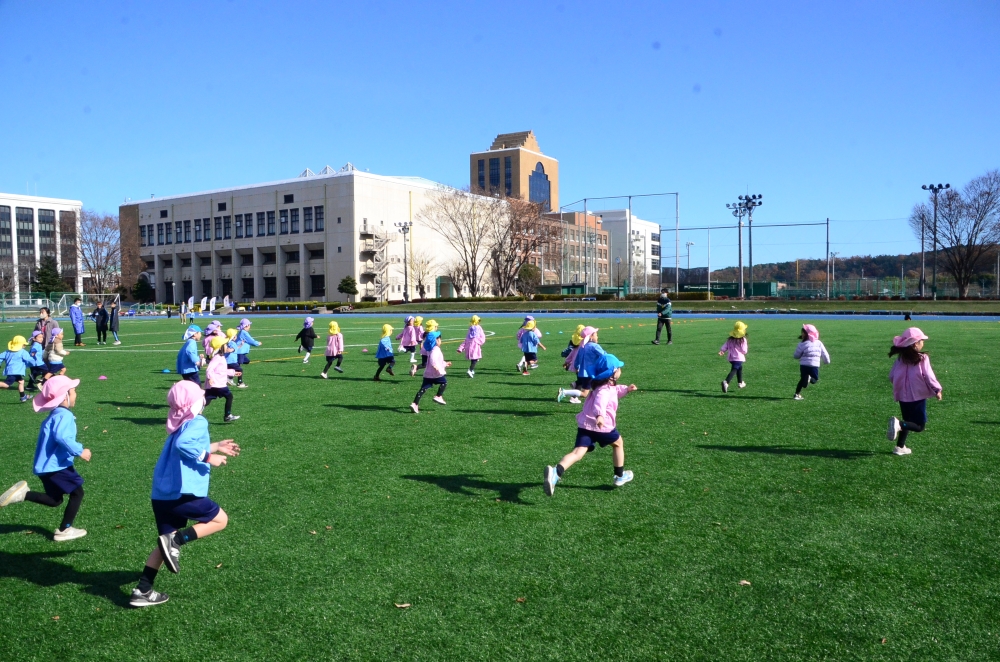 次は、400mの陸上競技場へ移動です。 ゴムチップの地面は走りやすく、みんな「よーい、ドン!」で全力疾走!広い空の下で走るのはとても気持ちよさそうでした。そこへ、大学のお兄さん・お姉さんが遊びに来てくれました。 広大なグラウンドを使って、大学生との「本気鬼ごっこ」がスタート! 鬼役のお兄さんお姉さんから、逃げ回って楽しい時間を過ごしました。