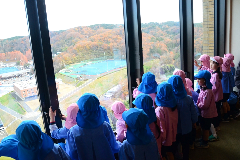 お腹がいっぱいになった後は、キャンパス内で一番高い建物の第二講義棟へ。 エレベーターに乗って、一気に15階まで上がりました。そこからの景色はまさに絶景! 「車が小さく見える!」「あっちに何があるかな?」 飯能市の緑豊かな景色や街並みを高いところから眺めて、ちょっとした空中散歩気分を味わいました。
