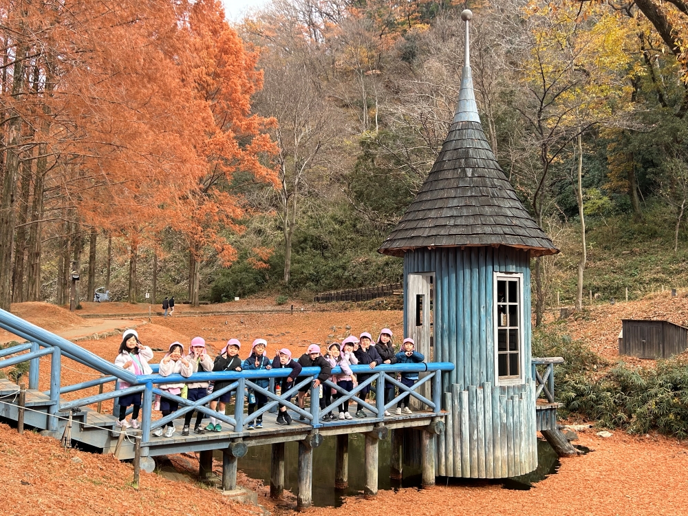 大学を出発した後は、すぐ近くにある「トーベ・ヤンソンあけぼの子どもの森公園」へ。 色鮮やかな紅葉の中、落ち葉を拾ったり、散策したりしてこの時期ならではの自然を楽しみました。