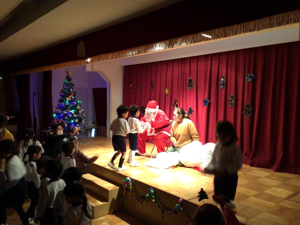 先生たちによる「ジングルベル」のハンドベル演奏が響き渡り、子どもたちがうっとりと聞き入った後、部屋の電気がフッと消え……サンタさんの登場です!