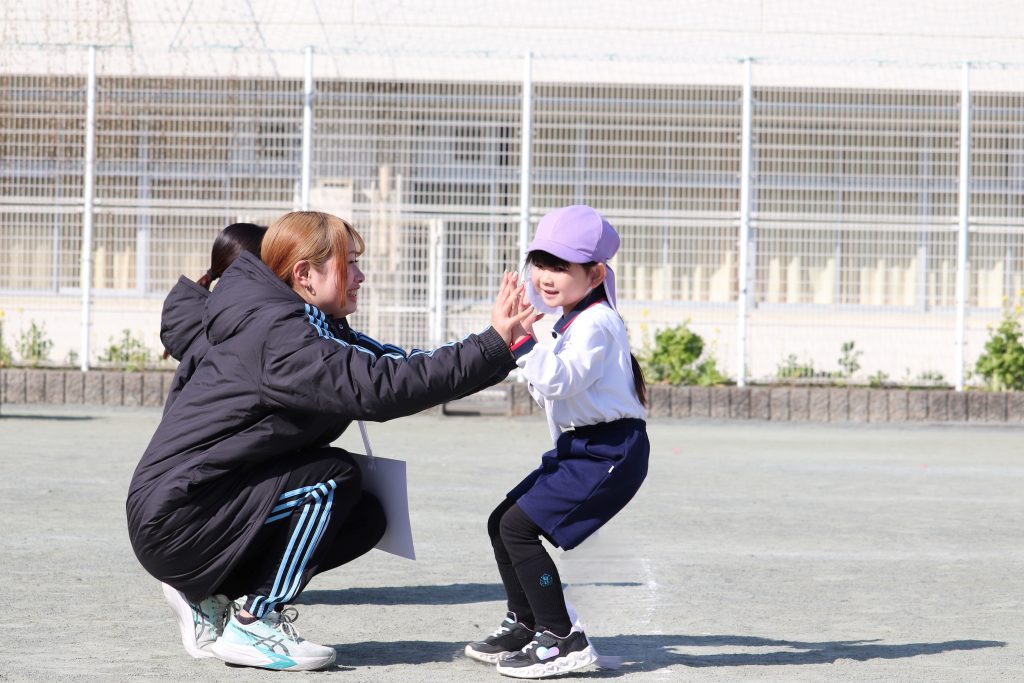 笑顔でハイタッチをして折り返し。次のお友達へ「がんばって!」と声をかけながらたすきを繋ぎます。