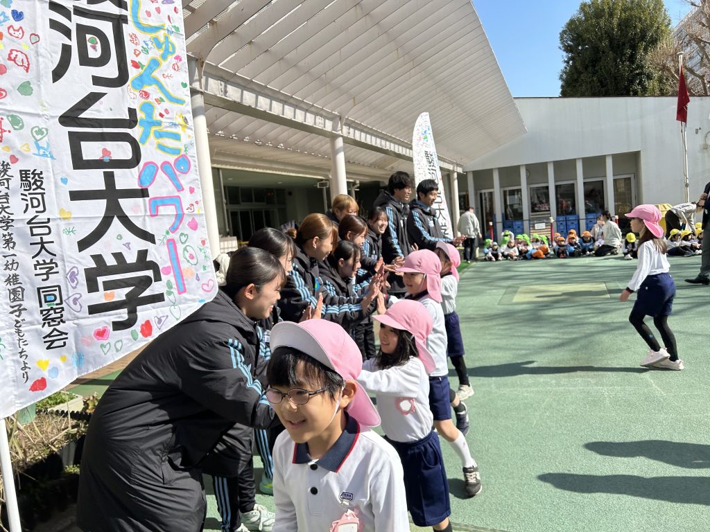 駿河台大学駅伝部の選手と監督の皆さんが、幼稚園に遊びに来てくれました! 以前、子どもたちが心を込めて作った「応援旗」への御礼にということで、素敵な交流の時間が実現しました。