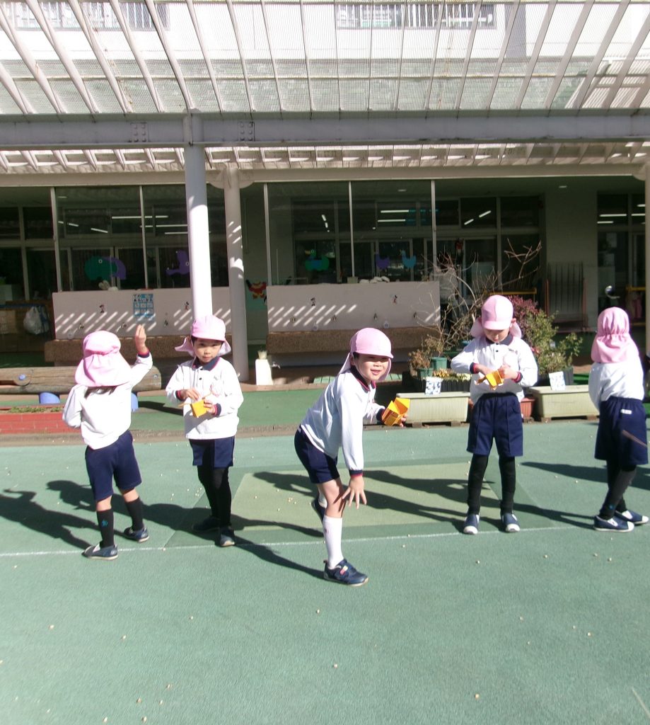 豆まきの前には、「みんなの心の中にはどんな鬼がいるかな?」とお話をしました。 「好き嫌い鬼」「おこりんぼ鬼」「夜ふかし鬼」……。子どもたちは自分自身を振り返り、「僕はごはんを残しちゃう鬼がいるかも!」「私はおしゃべり鬼を追い出す!」 と、退治したい鬼を心に決めて準備万端!園庭では、「おにわーそと!」と力強く豆を投げ、幼稚園に向かっては「ふくわーうち♪」と優しく豆をまきました。豆の香りを嗅いで「いいにおいがする!」と喜ぶ姿や、お友達を一生懸命応援する姿がとても印象的でした。