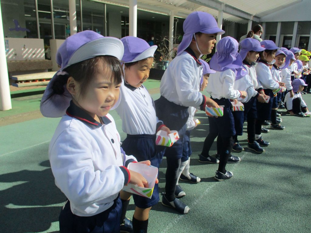 「節分」自分たちで作った手作りの「升(ます)」に豆を入れ、豆まきを行いました。