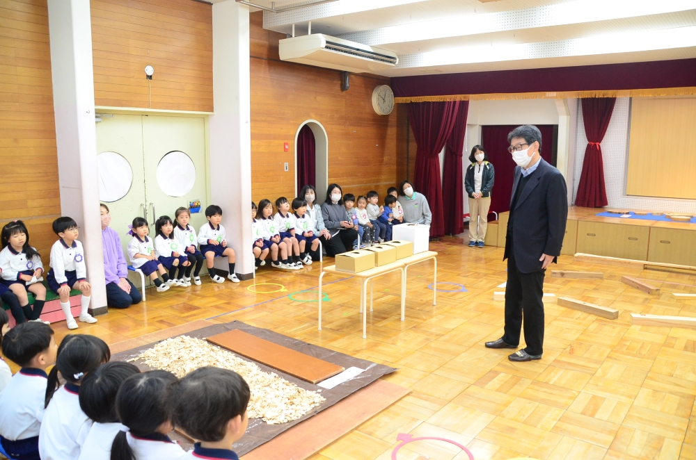 11月21日(金)、駿河台大学副学長でメディア情報学部教授の城井先生をお招きし、子どもたちが様々な方法で「木」と関わり、全身を使って遊ぶ貴重な体験を行いました。普段触れることのない多種多様な木の感触や匂い、音に、子どもたちは目を輝かせ夢中になっていました。
