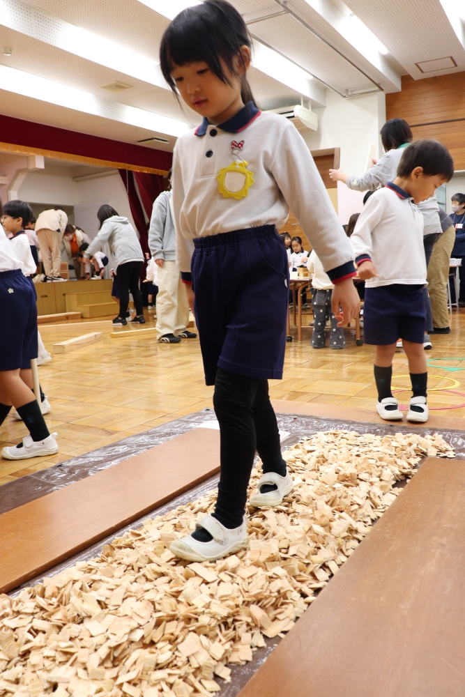 また、一本橋渡りとして、年輪のある丸い木の上を慎重に歩いたり、木のチップの上を歩いて音を感じるコーナーも人気でした。チップを踏んだ時の「パリッ、パキ」という音に、子どもたちは「良い音がする!」「踏むの楽しい!」と大喜びし、音と感触を楽しみました。