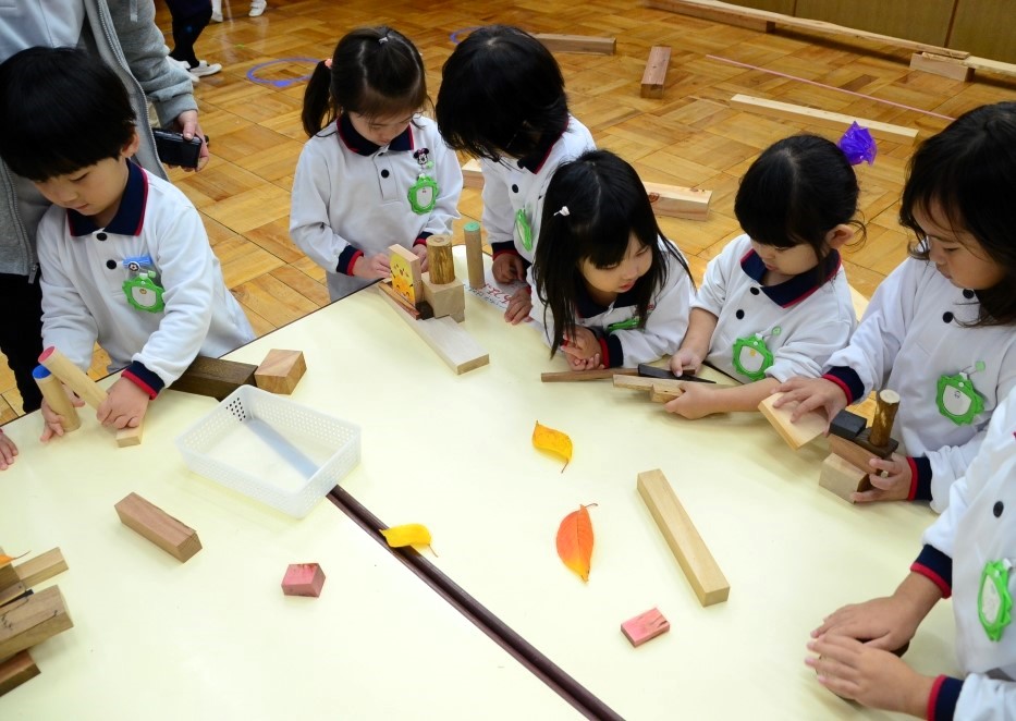 まず、様々な重さの木を持ち比べる重さ比べでは、「こっちの方が重い!」「なんで小さい方が重いんだろう?」と、見た目と重さの違いにびっくり。木の種類や色によって重さが違うという科学的な発見に繋がりました。
